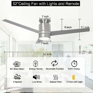 Show moreIntroducing the Flybull 52'' Ceiling Fans with Lights Flush Mount - the ultimate blend of function and style designed to transform your living spaces. This modern, low-profile ceiling fan features a sleek brushed nickel finish, complemented by three stunning double-sided blades, making it a versatile addition to any room. Offering 6 fan speeds and adjustable color temperatures, this ceiling fan adapts effortlessly to all your lighting needs while keeping the airflow just the way you like it. The convenient remote control allows you to easily adjust settings without having to leave the comfort of your seat, making this ceiling fan a true game-changer.