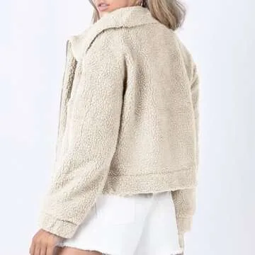 Flygo Women's Cropped Zip Up Lapel Shaggy Fleece Teddy Bear Jacket Coat (Beige-M)