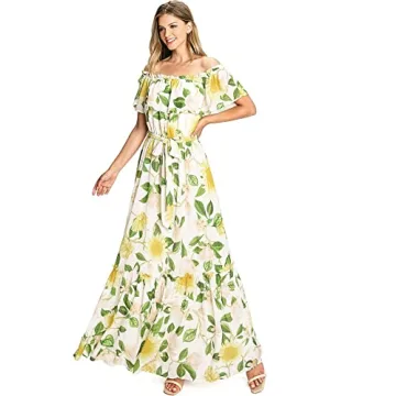 Show moreStep into a world of elegance and charm with the Flying Tomato Women's Off-Shoulder Floral Print Maxi Dress, a stunning piece that showcases a delightful floral print echoing the vibrant spirit of nature. This dress features an exquisite off-the-shoulder neckline, enhanced with a ruffle overlay draping gracefully to create a soft and feminine silhouette. Crafted for comfort and elegance, the stretchy waist embraces your figure, while the self-tie belt allows for a personalized fit that flatters all body types. Designed right in the heart of Los Angeles, California, this beautiful gown captures the essence of modern chic every woman desires.