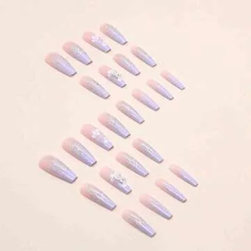 Foccna Purple Fake Nails Sequins Glitter Acrylic Flower Design Artificail Long Press on Nails, Purple Full Cover Fake Nails 3D Butterfly Rhinestone with Design Nail Tips for Women&Girls-24PCS