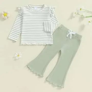 FOCUSNORM Toddler Baby Girl Outfits Ruffle Long Sleeve Striped Trim Tops + Flare Pants Set Toddler 2Pcs Fall Winter Clothes (Striped Green, 18-24 Months)