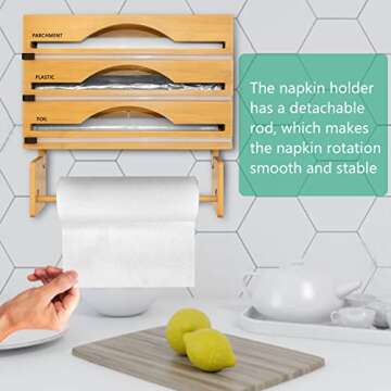 Foil and Plastic Wrap Organizer with Paper Towel Holder and Hook, Wall-Moun Bamboo Roll Organizer Holder with Cutter