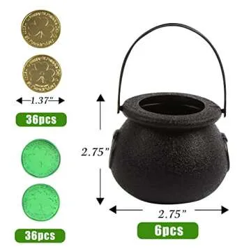 FOIMAS Mini Black Cauldron,6pcs Plastic Candy Kettle with 72pcs Shamrock Coins for St Patrick's Day Party Decoration Supply