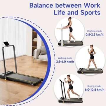Take advantage of its 2.5HP motor, delivering a powerful but quiet workout experience that operates under 45dB. Perfect for apartments or offices, this treadmill can handle users up to 300lbs and offers a speed range from 0.8 to 10.8 km/h. Use it as a compact walking pad under your desk with the handrail folded or unleash your full potential in running mode when the handrail is raised.