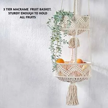Show more Introducing the Folkulture 3 Tier Hanging Fruit Basket, a stunning blend of functionality and style that is sure to transform your space. Measuring 46 inches long, including tassels at the bottom, this macrame hanging basket is not just a storage solution but a statement piece that brings a delightful bohemian vibe to any kitchen, living room, or outdoor setting. Its neutral tones complement a variety of interior designs, making it the perfect addition to enhance your home decor while keeping your space organized.