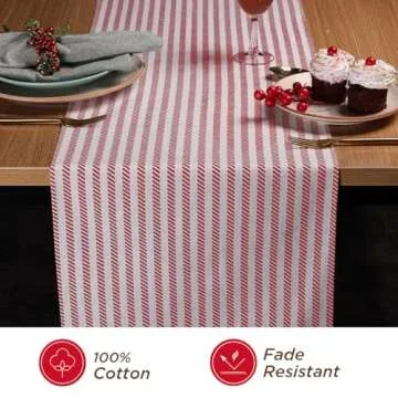 Show more Enhance your dining experience with the **Folkulture Farmhouse Table Runner**. Measuring a generous **72 inches long** and **14 inches wide**, this stunning table runner features vibrant red stripes that add an inspiring pop of color to any table setting. Crafted from **100% cotton**, its soft yet durable fabric allows for easy maintenance while ensuring a rustic charm that beautifully complements both modern and traditional decor styles. This table runner is not just a decorative element, it’s a statement piece that showcases an effortless bohemian aesthetic, transforming any surface it adorns.