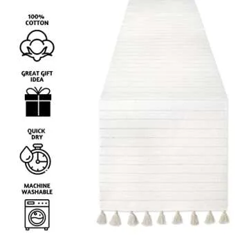 Show moreIntroducing the Folkulture Table Runners—an exquisite blend of style, functionality, and elegance! Measuring a generous 90 inches long and 14 inches wide, this stunning bohemian table runner is crafted from 100% cotton in a soft, natural off-white hue. Perfect for enhancing various settings, from a rustic farmhouse table to a chic kitchen countertop, it brings a touch of sophistication to any corner of your home. With its handcrafted ribbed stitching and charming tassels, this versatile piece serves not only as a table runner but also as a striking decorative accent that complements your unique style.