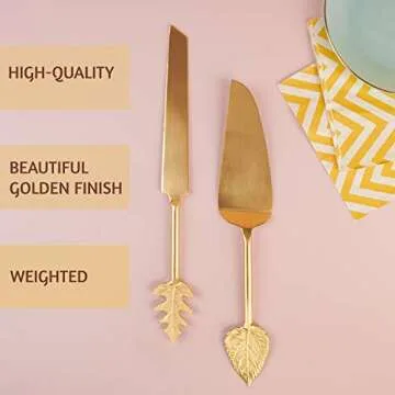Folkulture Wedding Cake Knife and Server Set, Stainless Steel Cake Cutting Set or Pie Patry Serving Set, Large 2-piece Dessert Set, Gold Leaf