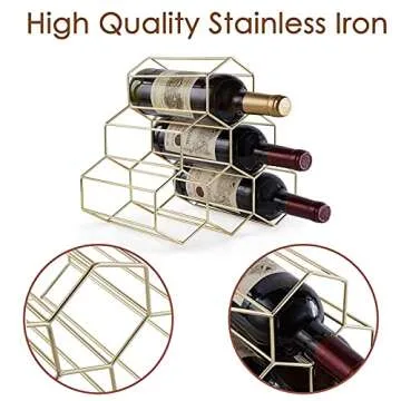 The innovative free-stand design features a geometric honeycomb structure that securely holds your wine bottles in place, preventing any risk of slipping or accidents. Constructed from high-quality iron and finished with a durable powder coating, this rack is built to last, resisting bends, scratches, and fading even in busy environments. Bring a touch of elegance to your space, whether you're a seasoned connoisseur or a new wine enthusiast.