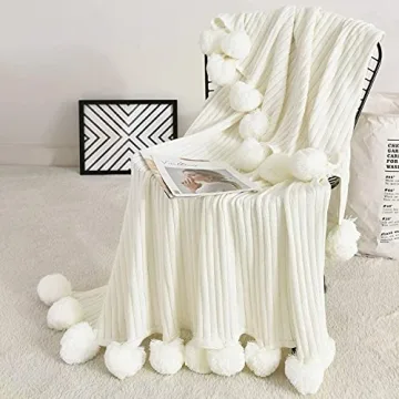 Fomoom Pom Pom Throw Blanket - Knit Blanket with Pompom Tassels