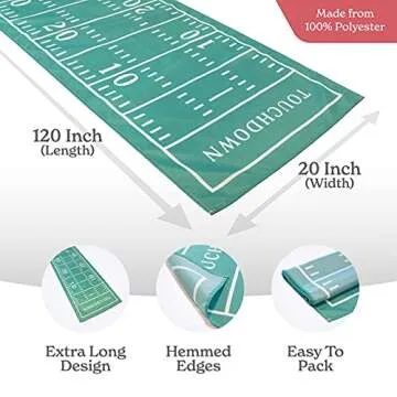 Show more Elevate your game day gatherings with our **Football Tablecloth for Parties**, the ultimate table runner for any football fanatic! Measuring an impressive **20” width x 120” length**, this beautifully designed table runner features a vibrant green and white pattern mimicking a football field, perfect for enhancing your party aesthetics. Crafted from **premium 100% polyester**, this tablecloth is not only visually appealing but also practical for any event, ensuring a sturdy and long-lasting decoration suitable for multiple uses. Whether you're gearing up for a thrilling Super Bowl watch or celebrating a child’s birthday with a sports theme, this table runner adds the perfect sporty touch.