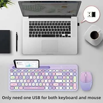 Show more Introducing the FOPETT 2.4GHz Wireless Keyboard and Mouse Set - your perfect companion for seamless productivity and stylish workspace aesthetics. This compact yet full-size ensemble is thoughtfully designed with the modern user in mind, featuring a vibrant 888 Purple Colorful finish that adds flair to your home or office setup. Experience the joy of silent typing and clicking with our specially engineered keyboard and mouse, boasting an impressive 80% reduction in noise levels. The keyboard and mouse ensure you can focus on your tasks without disturbing those around you, creating a peaceful work environment for everyone.