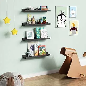 Forbena Black Wood Picture Ledge Shelf 24 Inch Set of 4, Long Floating Shelves for Wall with Lip, Rustic Display Shelves for Living Room Hallway Bedroom Office Photo Frames Bathroom Nail Polish