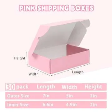 Show more Introducing the FORBFAN 7x5x2 Pink Shipping Boxes - the perfect solution for small businesses and enthusiasts alike! This delightful pack of 30 small cardboard boxes combines functionality with an elegant design, making your packaging both attractive and practical. Each box comes with a smooth protective film that not only enhances its aesthetic appeal but also provides a slight waterproof and scratch-resistant effect, ensuring your items stay dry and protected during transit. Crafted from thick recyclable cardboard, these boxes are built to last and can support up to 150 lbs of weight, making them ideal for shipping a variety of items. Whether you're mailing small soaps, toys, or gifts, the FORBFAN boxes ensure that your products arrive safely and in style.