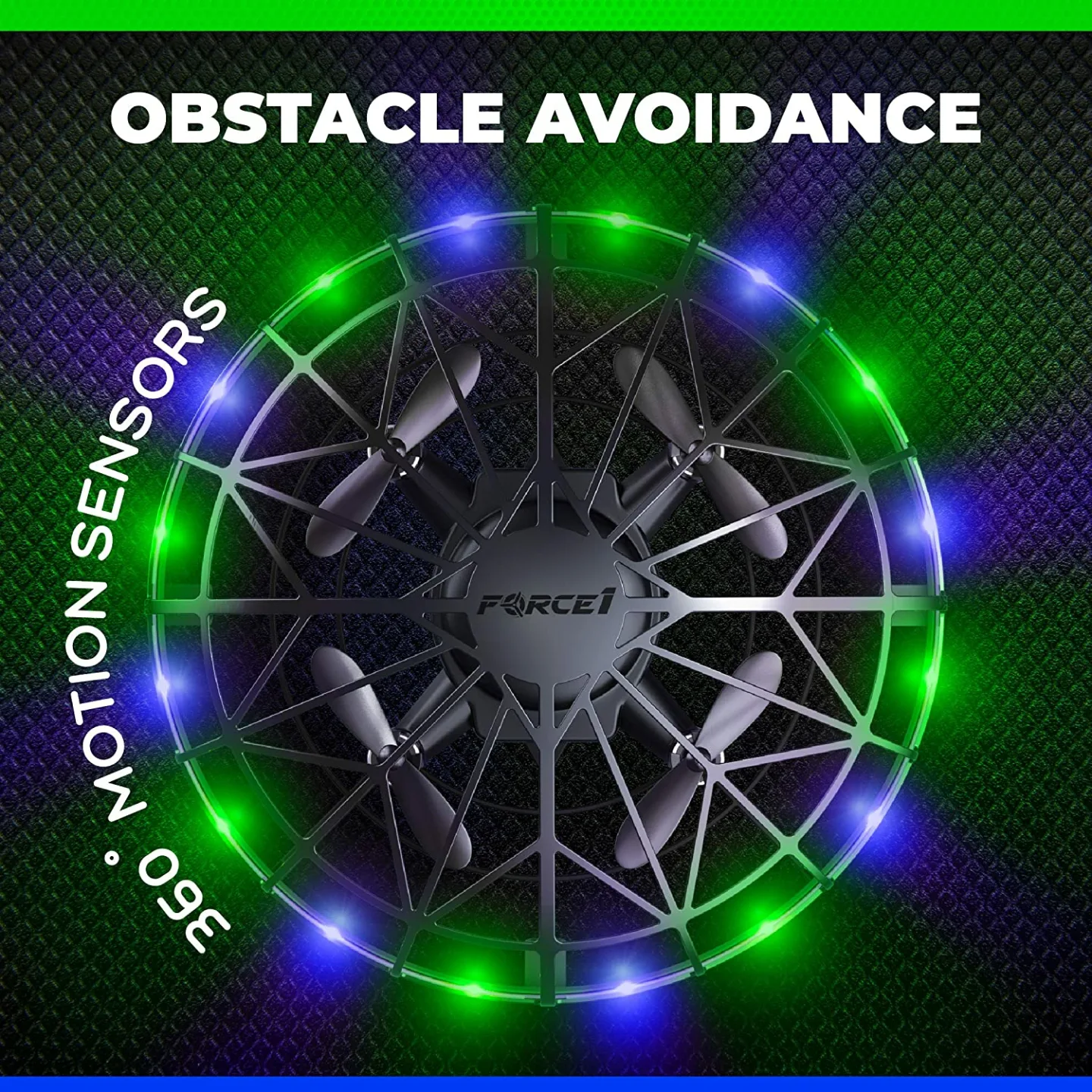 Key features of this product include incredibly bright green and blue LEDs, 360° rotational capabilities, intelligent obstacle-avoidance motion sensors, and a durable kid-safe webbed shell design. These features make the drone engaging for children and safe for indoor use, setting it apart from less durable toys.