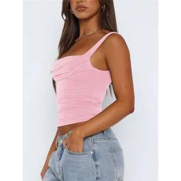 ForeFair Women Backless Ruched Tank Tops Sleeveless Square Neck Going Out Top Strappy Tight Slim Fit Cute Crop Top(S,Pink)