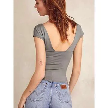 ForeFair Women Sexy Deep V Neck Backless Tank Top Slim Fit Summer Casual Y2k Crop Short Sleeve Top(Taupe,S)