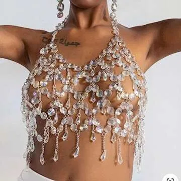 Formery Crystal Body Chain Rhinestone Halter Tassel Silver Body Jewelry for Women Summer Rave Beach Bra Chain