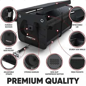 Show more The Fortem Premium Trunk Storage Organizer is a game-changer for anyone seeking tidy and efficient storage solutions in their vehicle. Crafted with a sturdy box design, it comes reinforced with rigid base plates that ensure durability and stability, supporting every side panel for long-lasting use. This organizer features a sophisticated combination of multiple compartments and side pockets, effectively reducing the clutter and mess that can accumulate in your car.