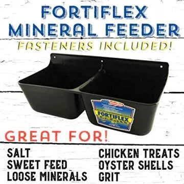 Show moreThe Fortiflex MF-2 Mineral Feeder is an essential tool for any livestock owner seeking to provide their animals with the necessary minerals and supplements. Designed with durability and convenience in mind, this feeder features two spacious 1.75 qt bins that can effectively dispense a wide range of feed options including minerals, vitamins, supplements, salt, oyster shells, and even liquids. Crafted from high-quality Fortiflex Plastic with an exclusive Fortally-Epdm Rubber HDPE Blend, it is built to withstand the rigors of farm life, ensuring longevity and performance. Plus, this feeder proudly comes 100% Made in the USA with a one-year warranty for additional peace of mind.