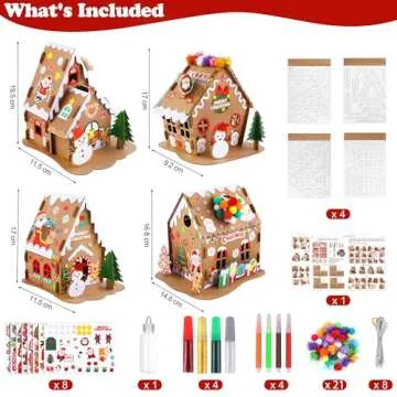 Show moreUnleash your creativity and spread festive cheer with the Fovths 4 Sets DIY House Kit Craft Kit. This delightful 71-piece set includes everything you need to build and decorate four charming gingerbread houses, uniquely designed to captivate both kids and adults alike. Whether you're a crafting novice or an experienced DIY enthusiast, this kit offers an enjoyable experience suitable for individuals of all ages. The festive gingerbread houses, made from high-quality cardboard, ensure durability as you bring your imaginative creations to life. With an abundance of accessories including 42 pieces of furry balls, markers, glitter glue, and stickers, personalizing your houses is not just easy, it’s a ton of fun!
