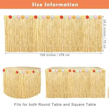 Show moreTransform your gatherings into vibrant tropical celebrations with the Fovths Luau Grass Table Skirt Natural. Measuring a generous 108 x 29.5 inches (276 x 75 cm), this stunning straw-colored grass table skirt adds the perfect festive touch to any Hawaiian-themed event. Crafted from high-quality polyester synthetic grass, it combines durability with a lightweight feel, making it easy to set up and reusable for all your summer festivities. The package includes three pairs of adhesive hoop and loop tapes, ensuring your table skirt remains securely in place, letting you focus on having a good time without worrying about decor mishaps.