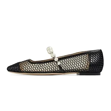 FOWT Women Square Toe Slip on Flats Pearl Studded Strap Elegant Pumps Wedding Bride Prom Dressy Shoes Size 7.5 Black Mesh