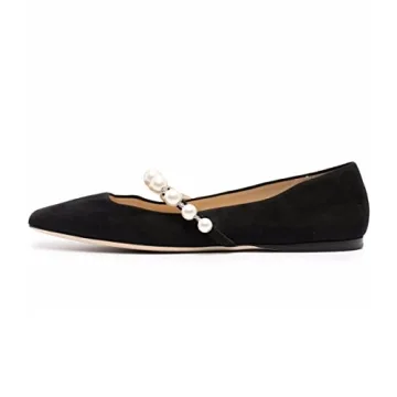 FOWT Women Square Toe Slip on Flats Pearl Studded Strap Elegant Pumps Wedding Bride Prom Dressy Shoe Size 8 Black