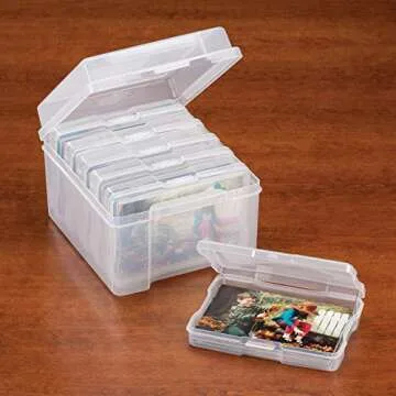 Show more Introducing the ultimate solution for photo organization – a versatile 7-piece photo storage set designed to not only protect your cherished memories but also to keep them beautifully arranged! This set includes six compact organizers, each capable of holding up to 100 4” x 6” or smaller photos, ensuring you can organize up to 600 photos with ease. The larger storage box features a hinged lid, snap closure, and a convenient carry handle, making it perfect for keeping your photographs safe and portable.