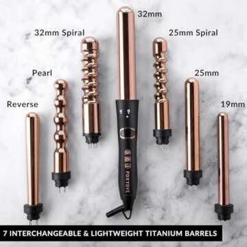 Show more Introducing the stunning Rose Gold 7-In-1 Curling Wand Set by FoxyBae, a revolutionary styling tool designed for those who are overwhelmed by the clutter of excessive curling irons! This set features an impressive 7 interchangeable curling iron barrels in sizes 19mm, 25mm, 32mm, and unique styles including pearl, reverse, and spiral barrels. With Titanium technology, this curling wand ensures even heat distribution, greatly minimizing damage to your hair while enhancing its natural beauty.