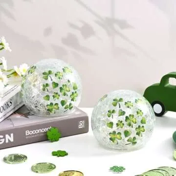 FRAMICS 2 PCS St Patricks Day Decorations 4" Shamrock Globe Night Light with Timer Clover Crackle Glass Ball Light for Table Centerpieces Lighted Decorative Ball Lamp Tabletop LED Light Decor Gift
