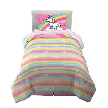 What sets this bedding apart is the dual design capability. The comforter flaunts Peppa Pig and her unicorn on one side, perfect for inspiring imaginative stories, while a colorful, all-over rainbow striped pattern adorns the reverse side. This means that you can effortlessly refresh the look of your child’s bedroom simply by flipping the comforter over!