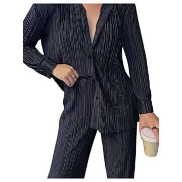 The ensemble features a button-down long sleeve shirt paired with loose fit casual wide leg pants. The elastic high waist on the pants ensures a comfortable fit, while the lightweight material makes this outfit ideal for hot days and cool nights alike. Available in various colors like black, pink, blue, and green, you can easily express your personal style.