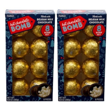 Show more Gift giving just became a delightful treat with the Frankford Hot Chocolate Bombs Double Pack! Perfect for both kids and adults, this enticing bundle includes 16 Hot Chocolate Bombs - eight innovative and delicious cocoa melting balls in each of the two beautifully designed boxes. Each bomb is crafted from rich, velvety Belgian milk chocolate, containing a surprise of mini marshmallows tucked inside. Simply drop one into a steaming mug, pour hot milk over it, watch as the magic unfolds, and stir to create a cozy and creamy hot chocolate experience that will warm anyone's heart.