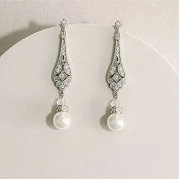Frankie Fashions Vintage Pearl Dangle Earrings Pearl Wedding Earrings for Brides Bridesmaids Mother of the Bride w/Stunning Pearls and Cubic Zirconia (Silver)