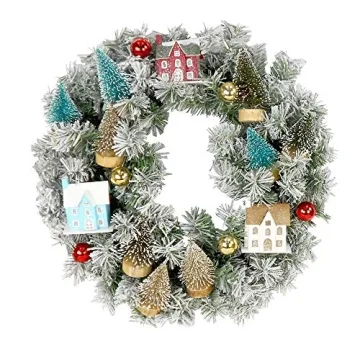 Show moreFraser Hill Farm 24-in. Snowy Christmas Village Wreath is the perfect holiday decor piece that transforms your home into a winter wonderland. Crafted with meticulous attention to detail, this beautiful wreath features handcrafted snow flocking, adding a touch of enchantment to any setting. Adorned with glittered bottle brush trees, vibrant shatterproof ornaments, and charming wooden houses, this wreath is ideal for welcoming guests at your front door or brightening up your fireplace mantle. It effortlessly combines elegance and festive cheer, making it a delightful addition to your seasonal decorations.