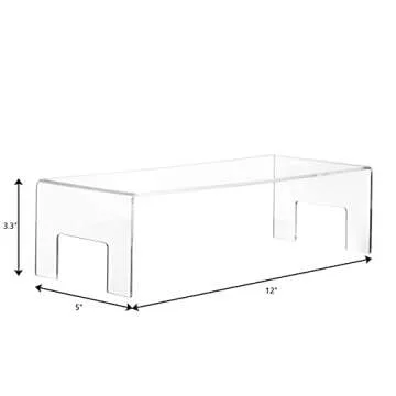 Show more Introducing the **Frcctre 2 Pack Clear Acrylic Display Stand Risers**, the perfect solution for showcasing your cherished items in a stylish and organized manner. Crafted from high-quality, thick 5mm acrylic material, these display risers are not only durable but also provide a sleek and transparent design that allows your items to shine. With dimensions of approximately **12"L x 5"W x 3.3"H**, these stands are designed to hold light and small items, making them ideal for displaying everything from jewelry and cosmetics to desserts and collectibles. Each stand comes protected by a **separate PROTECTIVE FILM**, ensuring they reach you in pristine condition—just rip it off to unveil the clear, glossy finish. Our upgraded design boasts enhanced sturdiness and stability, making these display risers a reliable choice for any setting.