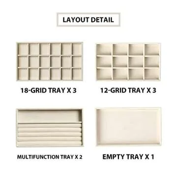 The **Frebeauty Jewelry Organizer Tray** is the ultimate solution for anyone seeking to elevate their jewelry storage experience. This exquisitely designed set includes a total of **9 trays**, featuring 18 grids tray (3 pcs), 12 grids tray (3 pcs), a versatile tray (2 pcs) with 4 ring slots and 1 long compartment, and an empty tray (1 pc). Perfectly sized to accommodate a wide variety of jewelry, including earrings, studs, necklaces, and bracelets, these trays bring organization and elegance to your collections.