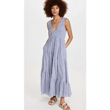 Show moreStep into the world of effortless summer elegance with the Free People Women's Juno Maxi Dress. Crafted from a mid-weight, non-stretch poplin fabric, this stunning dress blends comfort with style flawlessly. The smocked elastic bodice not only provides a flattering fit but also highlights your feminine silhouette, featuring a captivating V neck that adds just the right touch of allure. Transitioning to a playful cutout back with tie closure, this dress exemplifies modern chic. The tiered skirt flows beautifully, enhancing movement, while the delicate ruffle hem offers a whimsical flair. Dressed in a striking stripe pattern, available in an ivory combo and blue, this piece is designed to turn heads wherever you go. With on-seam side pockets and a full lining, it's as functional as it is fashionable sat in elegance.