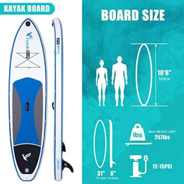 Stability is key when paddling, and the Freein SUP stands at 10'6" long and 31" wide, ensuring you have a rock-solid stable platform whether you're a beginner or an experienced paddler. With a maximum load capacity of 305 lbs, it allows for confident paddling across various water conditions, making it suitable for all users and ideal for family outings.