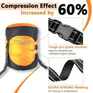 Show more The Frelaxy Compression Stuff Sack is an innovative solution that revolutionizes how you pack for your adventures. With the ability to SAVE 40% MORE SPACE, this mushy sack enables you to carry everything you need without the bulk. Made from high-quality 210T Tear Resistant Polyester, it strikes the perfect balance between lightweight - weighing only 80g to 160g depending on size - and durability. Its water-resistant coating ensures that your valuables remain dry even in unpredictable weather, making it a reliable companion no matter where your journey takes you.