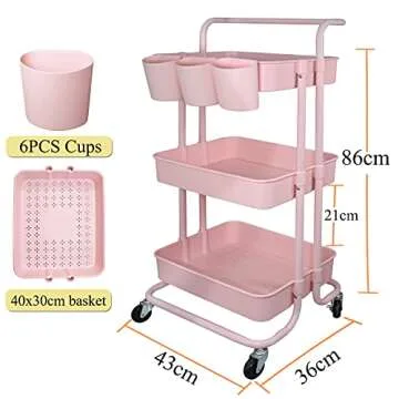 Freletry 3 Tier Utility Rolling Cart Storage Organizer Shelf Rack with 6PCS Hanging Cups for Home Office Kitchen Bathroom Storage (Pink)