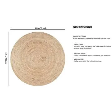 Show more This stunning handwoven jute area rug, measuring 6 feet round, is a perfect addition to any home decor. Designed by Frelish, a brand known for its commitment to quality and craftsmanship, this rug is more than just a floor covering; it is a statement piece. Each rug is handmade by artisans in India, ensuring that each one possesses unique characteristics that showcase intricate artistry. Crafted from renewable natural fibers, its eco-friendly design speaks to modern sensibilities.