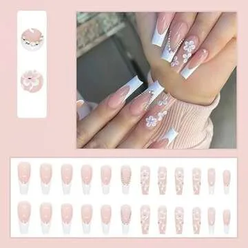 French Coffin White Tip Fake Nails Press on Nails Long Flower and Rhinestones Designs False Nails Nude Pink Full Cover Acrylic Glue on Nails Suitable for summer Stick on Nails for Women 24Pcs