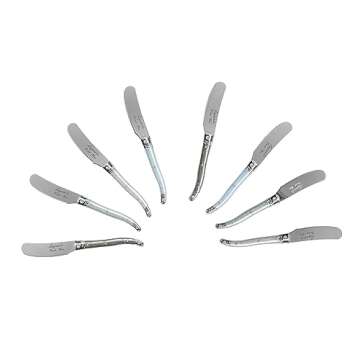 Show more Elevate your hosting game with the French Home Laguiole Spreader Set, an exquisite 8-piece collection designed to enhance any table setting. Each cheese spreader knife, measuring an elegant 6.25 inches, is crafted with the iconic Laguiole design, featuring comfortable, curved handles adorned with three rivets and the signature Bee Emblem on the bolster. The graceful aesthetics of Mother of Pearl handles bring a touch of timeless sophistication to your gatherings, ensuring every spread is not just a moment but an experience of indulgence.