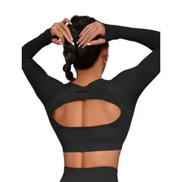 FRESOUGHT Athletic Crop Top Long Sleeve for Women Workout V Neck Running Tops Backless Gym Yoga Seamless Shirts Open Back Active Clothes Black