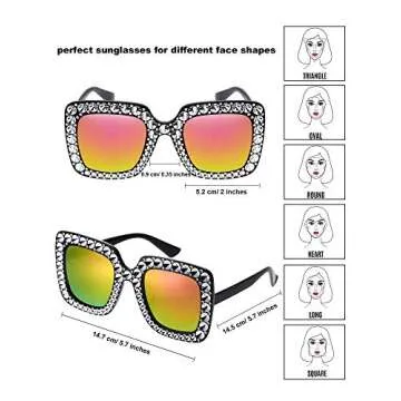 Designed with reinforced metal hinges and embellished with rhinestones, these sunglasses are crafted to dazzle and built to last. The intricate details like the diamond-like faux crystals plated groove enhance the attraction, making you stand out wherever you go. With a lens diameter of approximately 5.2 cm and a temple length of around 14.5 cm, these oversized sunglasses are perfectly tailored to fit most women graciously.