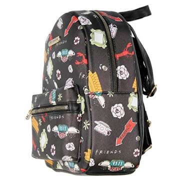 Show moreThis stunning mini fashion backpack is more than just an accessory; it’s a vibrant expression of your love for the iconic television series, Friends. Featuring a fabulous allover toss print pattern with rich designs related to the beloved show, this bag is beautifully made from faux Saffiano leather which enhances its charm and durability. Designed for fans who appreciate style and quality, it delivers both in grandeur and functionality.