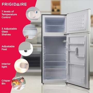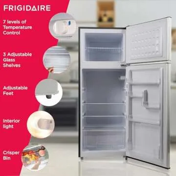Show more The Frigidaire EFR753 2 Door Apartment Size Refrigerator is a stunning blend of retro aesthetics and modern functionality, designed to elevate the appearance and efficiency of your kitchen. With its eye-catching chrome recessed door handles and premium platinum series stainless steel finish, it brings a sophisticated charm that is sure to impress anyone. This refrigerator not only serves as a stylish addition to your home but also ensures your food remains fresh and easily accessible. The separate freezer with a dedicated shelf provides ample space for frozen items, making it versatile for various living needs.