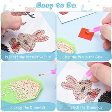 Show more Unleash your creativity with our delightful DIY Diamond Art Painting sticker kit! This enchanting craft set includes everything you need to create 34 vibrant stickers, making it an ideal gift that combines fun and artistry. The package contains two applicator pens, two glue containers, two plastic trays, 18 bags of dazzling diamonds, along with detailed instructions, reference patterns, and sticky backings. This kit offers an engaging experience where you'll make your own beautiful art rather than just coloring by numbers.
